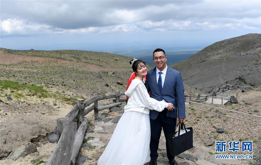 7月8日,一對新人在長白山北景區(qū)主峰上拍照。新華社記者林宏攝
