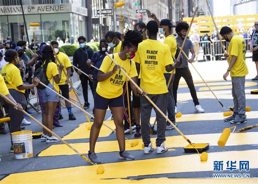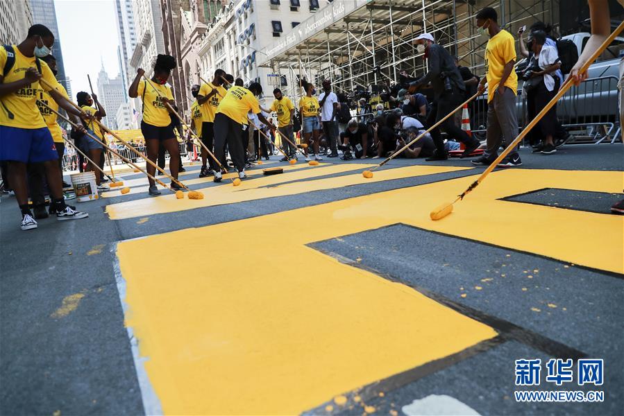 7月9日,在美國(guó)紐約第五大道特朗普大廈前,人們涂寫(xiě)“黑人的命也是命”標(biāo)語(yǔ)。當(dāng)天,數(shù)十人在紐約第五大道特朗普大廈前的路面上涂寫(xiě)“黑人的命也是命”標(biāo)語(yǔ)。紐約市計(jì)劃在多處地點(diǎn)涂寫(xiě)“黑人的命也是命”標(biāo)語(yǔ)。新華社記者王迎攝