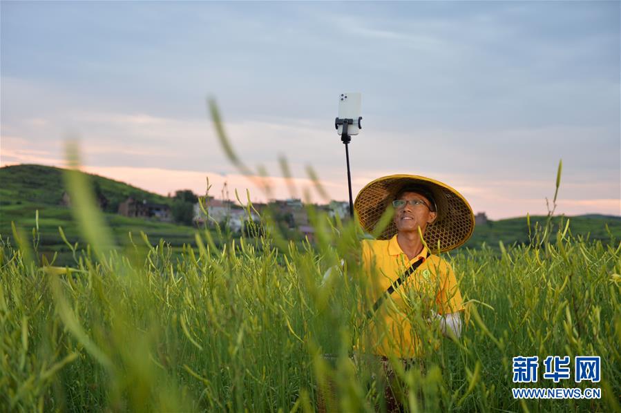 7月12日清晨,祁東縣官家嘴鎮(zhèn)草源沖村,一名菜農(nóng)在采摘黃花菜的間歇用手機(jī)進(jìn)行視頻直播。新華社記者 趙眾志 攝