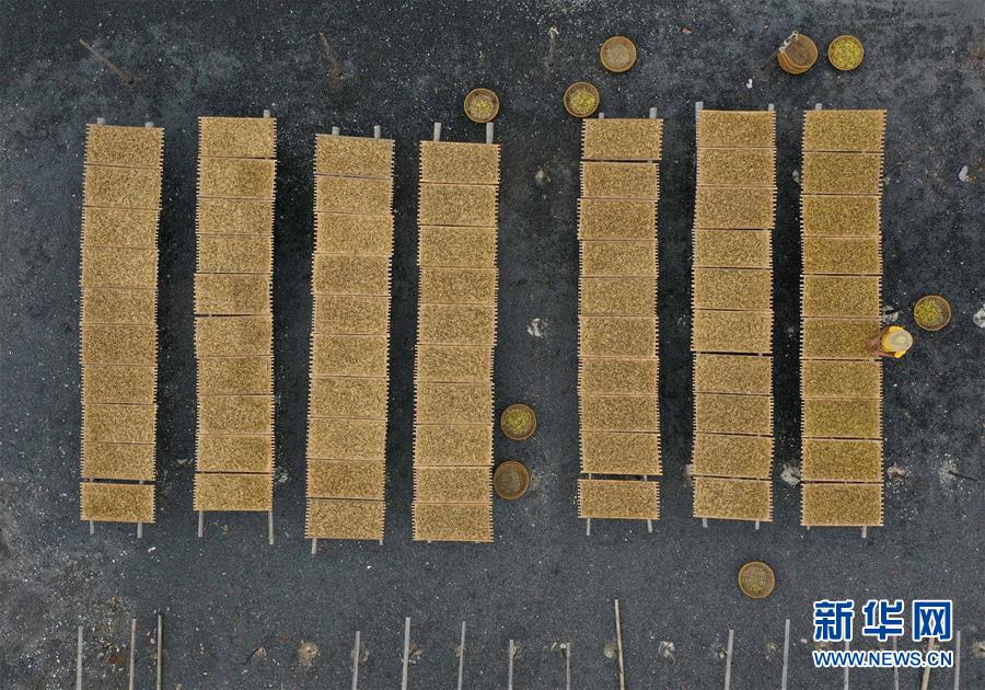 7月12日,祁東縣黃土鋪鎮(zhèn)雷公殿村,村民在晾曬黃花菜(無(wú)人機(jī)照片)。新華社記者 趙眾志 攝