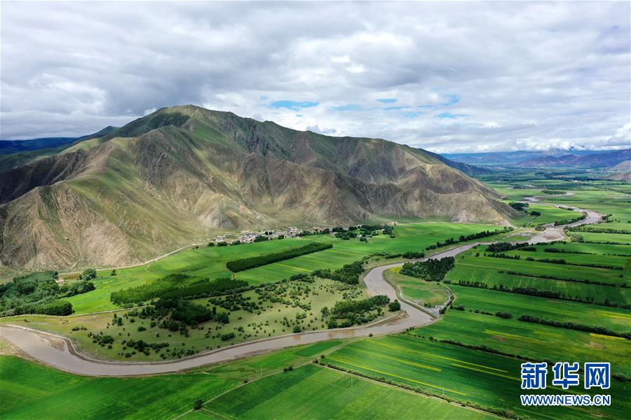 拉薩市林周縣邊交林鄉(xiāng)田園景色(7月14日攝,無(wú)人機(jī)照片)。林周縣地處西藏中部,拉薩河上游。夏日時(shí)節(jié),這里水草豐茂,綠意盎然,河流、村落、農(nóng)田組成一幅美麗的田園畫卷。新華社記者 詹彥 攝
