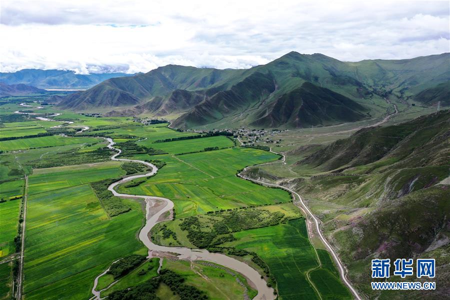 拉薩市林周縣江熱夏鄉(xiāng)田園景色(7月14日攝,無(wú)人機(jī)照片)。林周縣地處西藏中部,拉薩河上游。夏日時(shí)節(jié),這里水草豐茂,綠意盎然,河流、村落、農(nóng)田組成一幅美麗的田園畫(huà)卷。新華社記者 詹彥 攝
