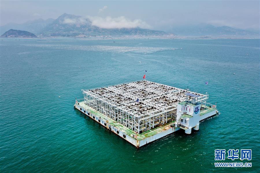 7月14日拍攝的位于福建省連江縣苔菉鎮(zhèn)海域的深遠(yuǎn)海養(yǎng)殖平臺(tái)“福鮑一號”(無人機(jī)照片)。