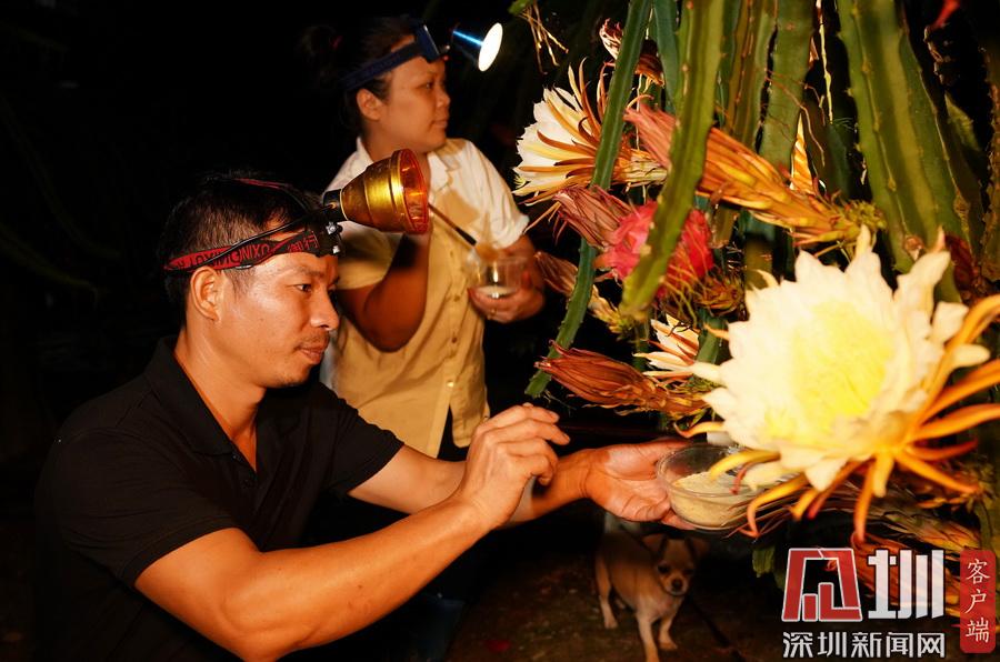 2020年7月14日晚,在廣西融水苗族自治縣融水鎮(zhèn)三合村黎鄧屯,兩名村民正在給紅心火龍果“點花”。