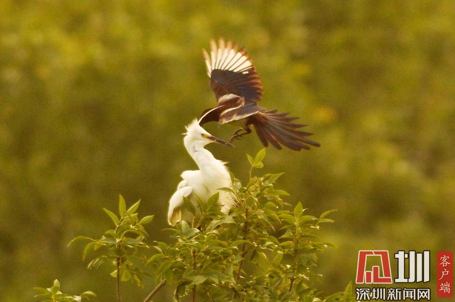 2020年7月14日,在山東省青島市城陽區(qū)紅島街道一處林間,晚歸的白鷺與喜鵲在枝頭“蹁躚起舞”,優(yōu)美如畫。