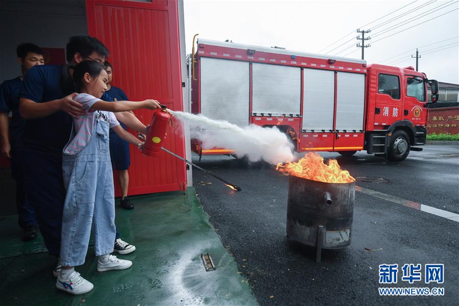 7月16日,一名小學(xué)生在東林鎮(zhèn)消防綜合應(yīng)急救援隊(duì)隊(duì)員的指導(dǎo)下學(xué)習(xí)使用滅火器。當(dāng)日,浙江省湖州市吳興區(qū)東林鎮(zhèn)舉辦暑期“安全防護(hù)小超人”主題活動(dòng)?;顒?dòng)由醫(yī)護(hù)人員、消防隊(duì)員等為學(xué)生及家長(zhǎng)講授日常安全避險(xiǎn)及溺水急救知識(shí),中小學(xué)們還在現(xiàn)場(chǎng)學(xué)習(xí)了簡(jiǎn)易包扎、心肺復(fù)蘇的正確方式,并了解滅火器、滅火毯等消防器材的使用,為學(xué)生平安過暑期打好安全防護(hù)“預(yù)防針”。新華社記者 徐昱 攝