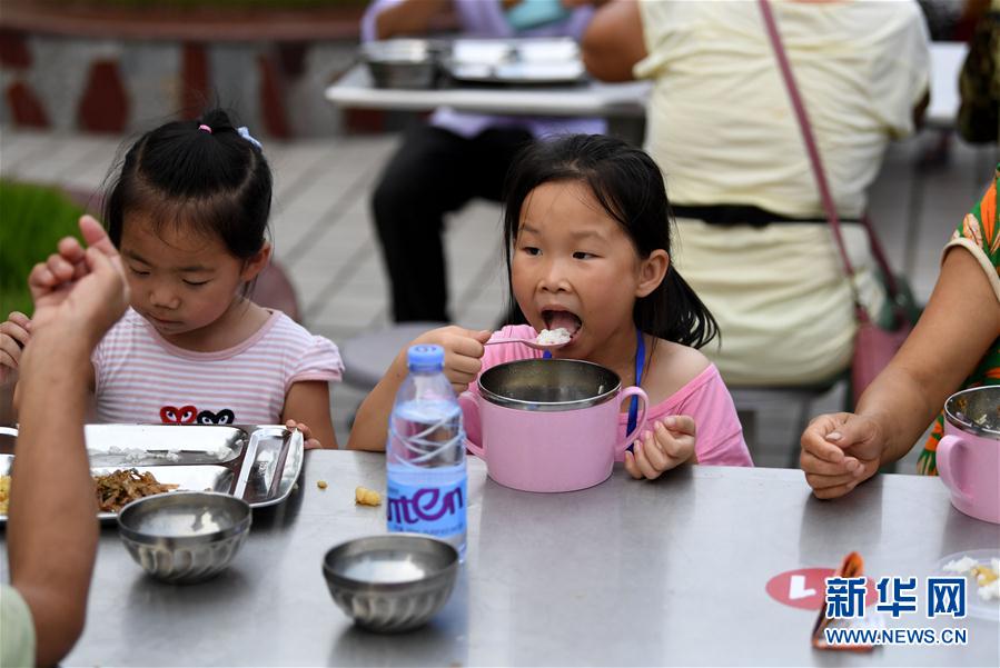 7月14日,在安徽省宿松縣洲頭鄉(xiāng)中心小學(xué)集中安置點,小朋友在吃晚餐。新華社記者劉軍喜攝