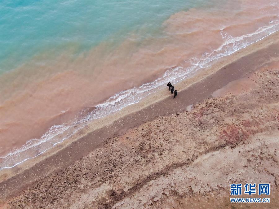 在可可西里索南達(dá)杰保護(hù)站管護(hù)區(qū)域內(nèi)的湖泊附近,龍周才加(中)與隊友才仁多杰(左)、王文豪在巡視(6月30日攝,無人機(jī)照片)。新華社記者張龍攝