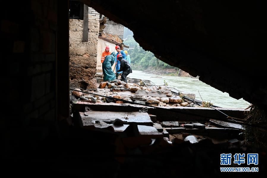 7月10日,救援人員在武夷山市洋莊鄉(xiāng)大安村幫助一戶受災(zāi)村民清理雜物。7月8日以來,福建南平市多個縣市普降暴雨或大暴雨,造成部分縣市房屋倒塌、農(nóng)田被淹、道路沖毀。新華社記者林善傳攝