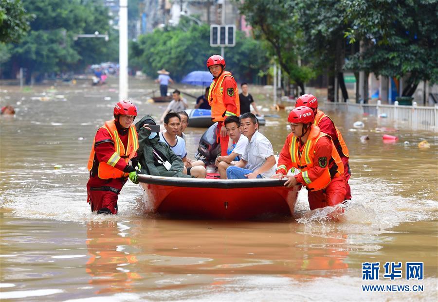 7月11日,廣西融水消防救援大隊的救援人員在轉(zhuǎn)移被困群眾。受連日強(qiáng)降雨影響,廣西柳州市融水苗族自治縣融江水位暴漲,導(dǎo)致縣城出現(xiàn)嚴(yán)重洪澇災(zāi)害。新華社記者黃孝邦攝