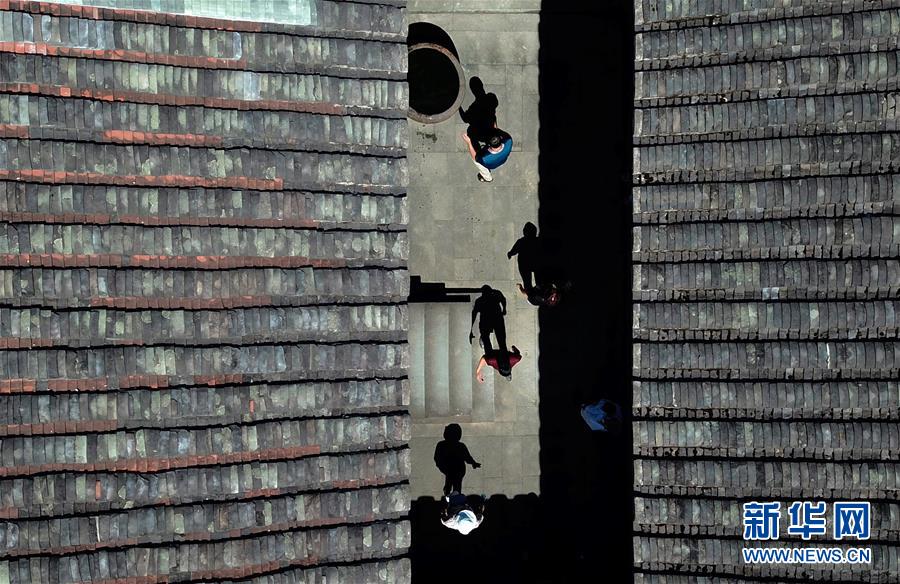 7月19日,游客們?cè)谟捞┛h同安鎮(zhèn)愛荊莊里觀賞游玩(無人機(jī)照片)。近年來,福建省福州市永泰縣重視古莊寨保護(hù)與利用工作,遵循“保護(hù)為主、修舊如舊”原則,加大修繕保護(hù)力度,通過對(duì)古莊寨古村落等物質(zhì)載體進(jìn)行活化利用,打造莊寨+旅游、莊寨+研學(xué)等產(chǎn)業(yè)發(fā)展模式,帶動(dòng)鄉(xiāng)村振興。永泰縣地處福州西南部,擁有保存較好的古莊寨152座,面積1000平方米以上、年代100年以上98座。新華社記者魏培全攝