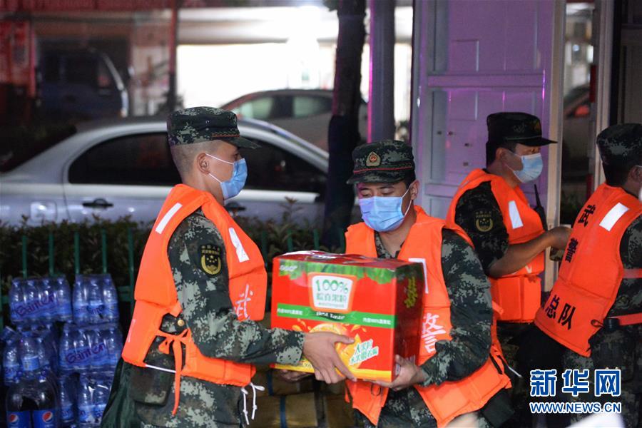 7月20日凌晨,在位于蒙洼蓄洪區(qū)內(nèi)的老觀鄉(xiāng)老觀村,武警安徽總隊阜陽支隊的官兵幫助一家超市轉(zhuǎn)移貨物。新華社記者黃博涵攝