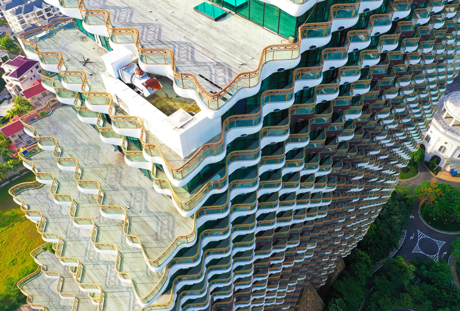 2020年7月20日,海南省三亞市,圖為航拍的“九棵大樹”建筑群。建筑物陽臺均為波浪形,視野良好,契合三亞“?!钡膶傩浴?/p>