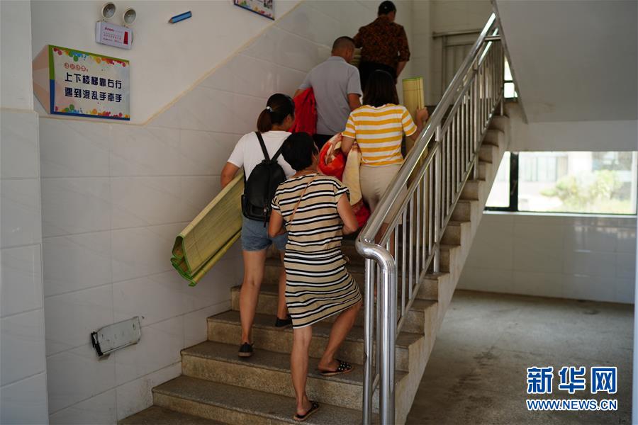 在江西永修縣湖東學校安置點,群眾攜帶行李前往安置住處(7月13日攝)。新華社記者周密攝