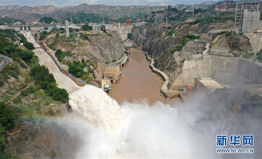 7月21日,劉家峽水庫正在泄洪(無人機照片)。新華社記者陳斌攝