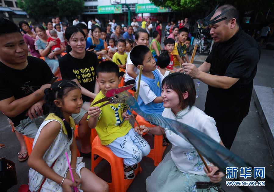 7月21日,“衛(wèi)家班皮影戲”劇團的藝人們在和睦橋村的文化禮堂前給孩子們演示皮影戲道具。新華社記者徐昱攝