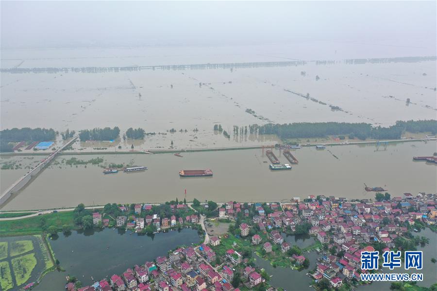 這是7月21日拍攝的被淹的南京市高淳區(qū)陽(yáng)江鎮(zhèn)勝利圩(畫面左側(cè))(無(wú)人機(jī)照片)。新華社記者季春鵬攝