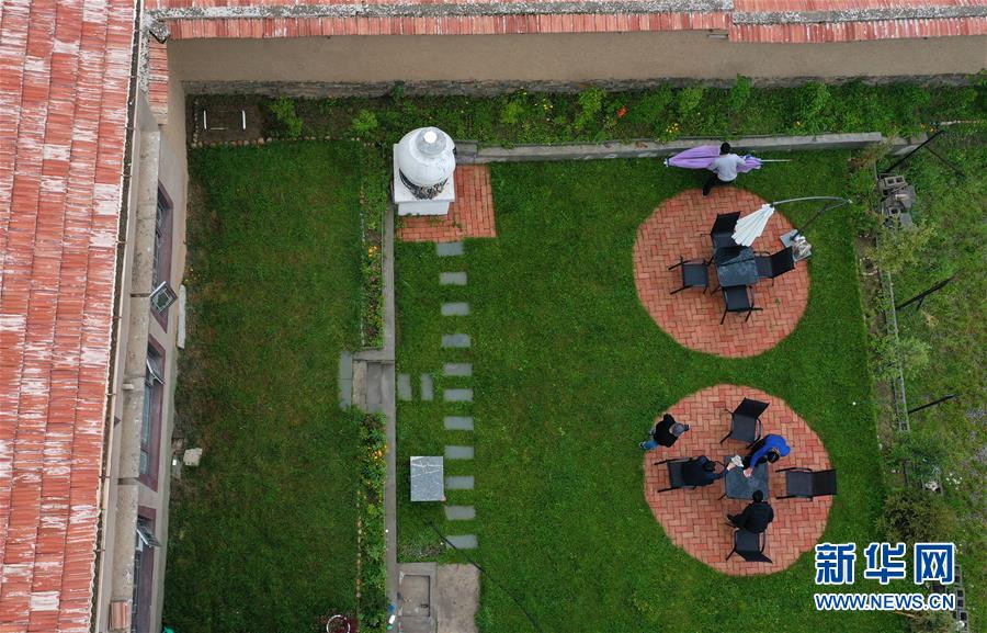 7月5日拍攝的阿壩縣查理鄉(xiāng)神座村客棧院落(無(wú)人機(jī)照片)。新華社記者陳天湖攝