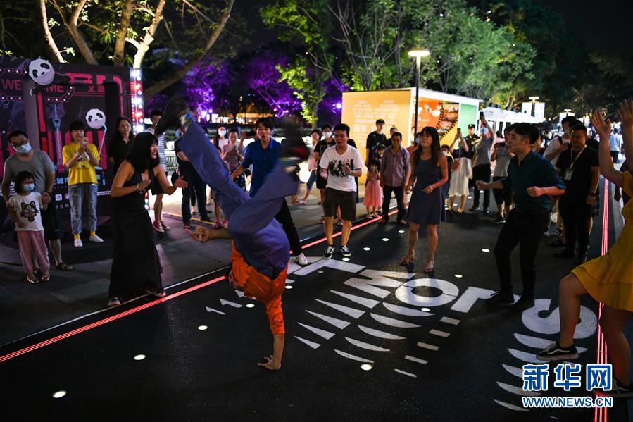 7月23日晚,在成都市成華區(qū)望平街濱河路的天府文創(chuàng)大集市上,演員在表演街頭環(huán)境音樂(lè)劇。新華社記者 王曦 攝