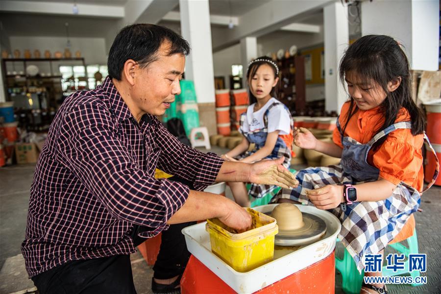 母先才在陶藝體驗館里教小游客如何使用陶藝?yán)鳈C(7月14日攝)。新華社記者 陶亮 攝