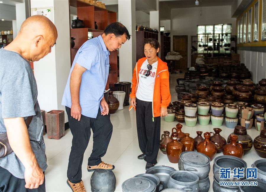 母先才在查看售賣的陶器產(chǎn)品(6月16日攝)。新華社記者 陶亮 攝