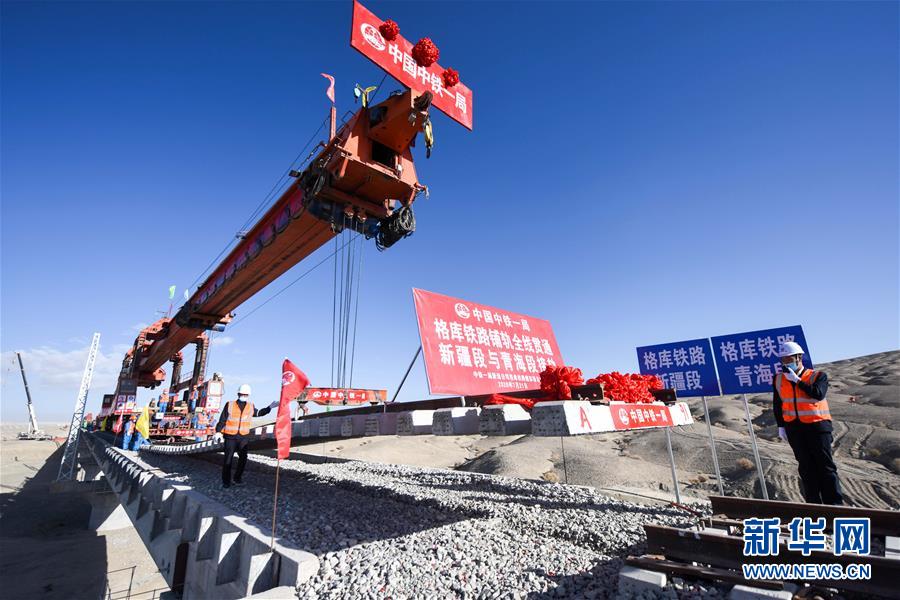 中鐵一局的施工人員在格庫鐵路新疆段鋪設最后一組軌排(7月21日攝)。新華社記者 丁磊 攝