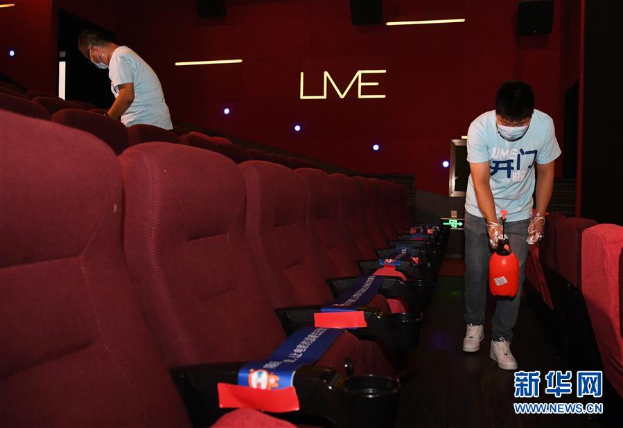7月24日,在UME影城北京華星店1號影廳,工作人員進行消殺清潔工作。當日,在做好新冠肺炎疫情防控的前提下,北京市部分電影院有序恢復開放。新華社記者 任超 攝