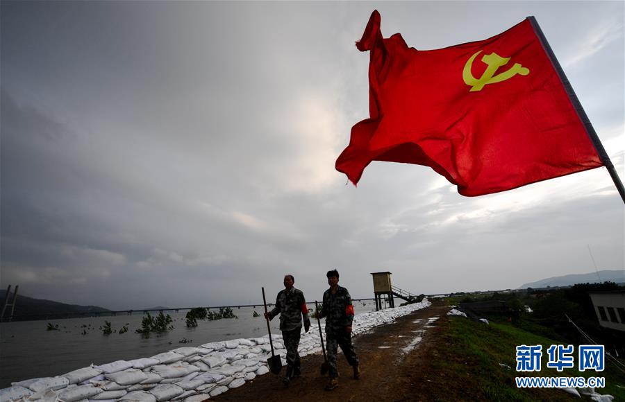 7月19日,傍晚時分,陳申桃(左)和兒子在圩堤上行走。新華社記者胡晨歡攝