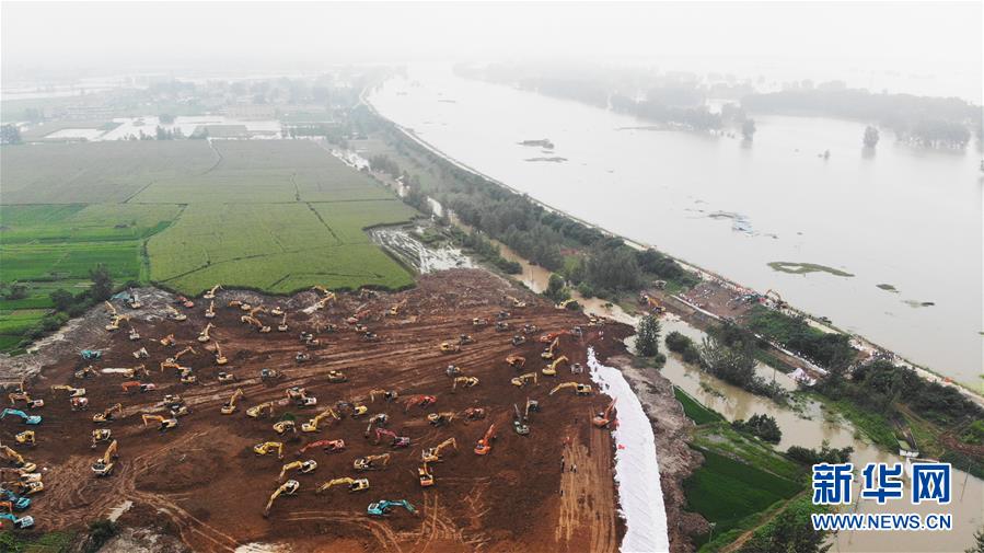 7月28日,在姜唐湖蓄洪區(qū)戴家湖一處涵閘險(xiǎn)情處置現(xiàn)場,人們操作機(jī)械設(shè)備在搶筑臨時(shí)圩堤(無人機(jī)照片)。新華社記者黃博涵攝