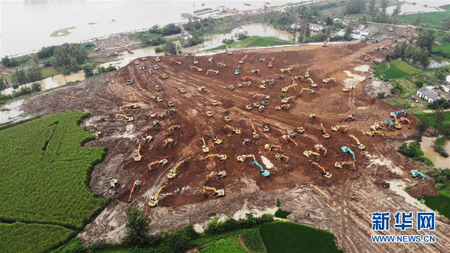 7月28日,在姜唐湖蓄洪區(qū)戴家湖一處涵閘險情處置現(xiàn)場,人們操作機械設(shè)備在搶筑臨時圩堤(無人機照片)。新華社記者黃博涵攝