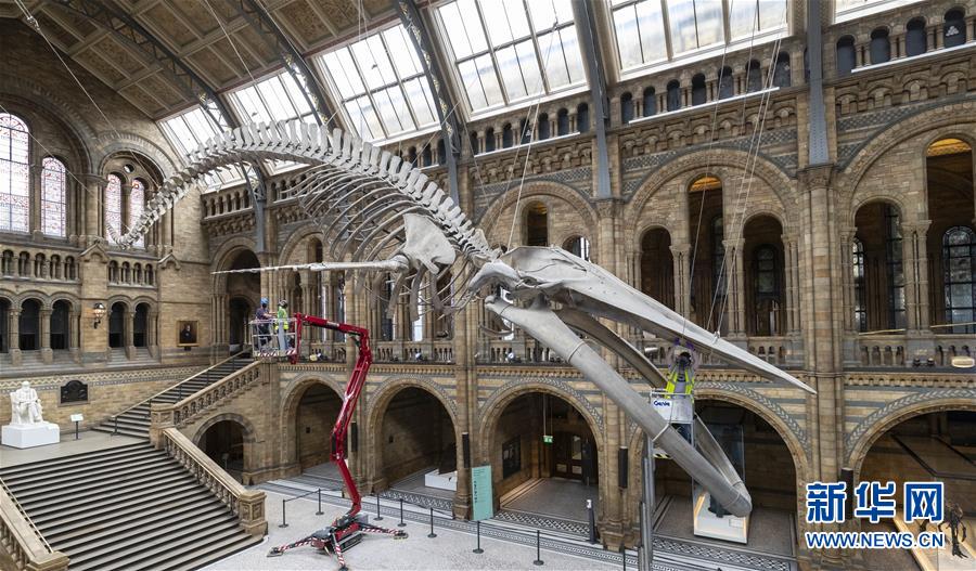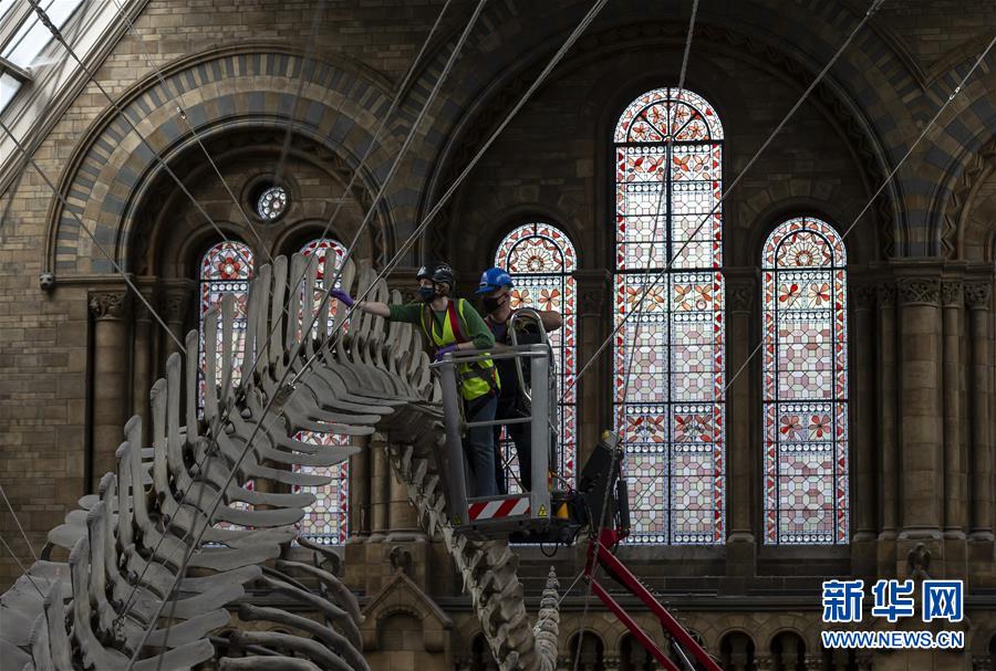 7月27日,工作人員在英國倫敦的自然歷史博物館大廳內(nèi)清潔一具藍(lán)鯨骨架。受新冠疫情影響關(guān)閉數(shù)月的英國自然歷史博物館將于8月5日重新對外開放,目前館方正在為重新開放做最后準(zhǔn)備。參觀者需要提前預(yù)約參觀時段、全程佩戴口罩且保持安全距離。新華社記者韓巖攝