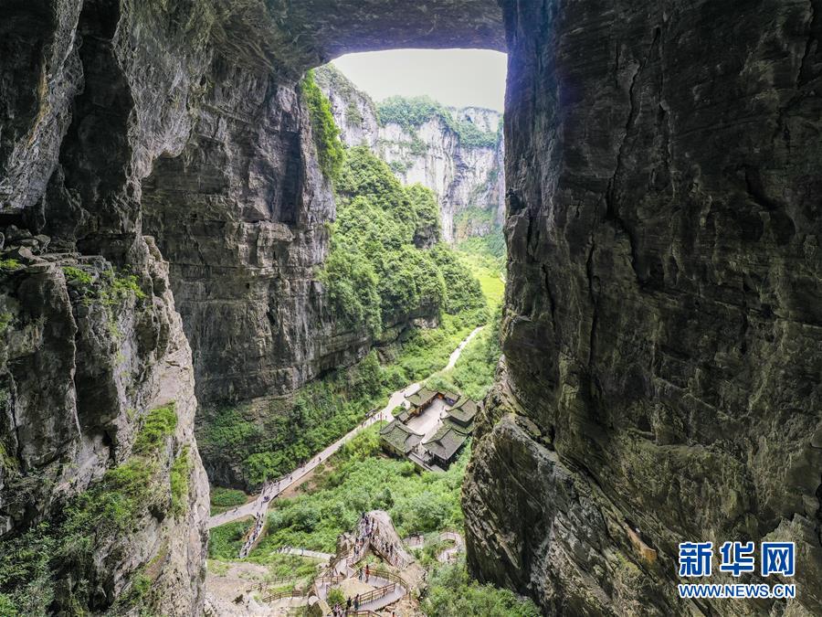 7月29日,游客在天生三橋景區(qū)內(nèi)的天龍橋景點(diǎn)游覽(無(wú)人機(jī)照片)。新華社記者劉潺攝