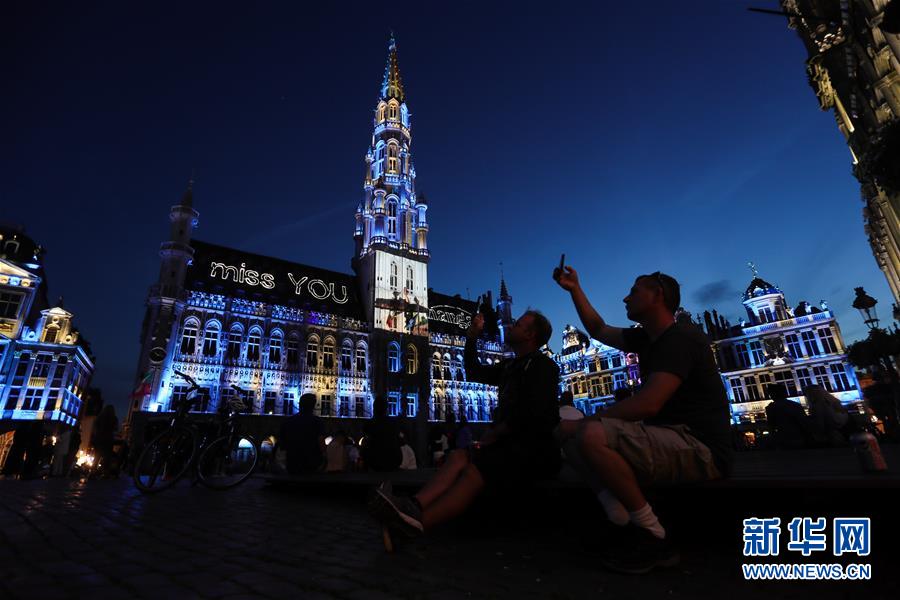 7月29日,人們在比利時(shí)布魯塞爾大廣場欣賞聲光秀,市政廳外墻上投射出“想念你,音樂”的字樣。7月29日,比利時(shí)布魯塞爾大廣場舉行大型聲光秀。藝術(shù)家在市政廳等歷史建筑上投影文字和圖案,紀(jì)念這個(gè)夏天受新冠疫情影響而不能如期舉辦的文化活動。新華社記者鄭煥松攝