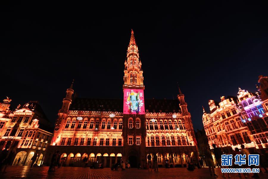 7月29日,人們在比利時(shí)布魯塞爾大廣場欣賞聲光秀。7月29日,比利時(shí)布魯塞爾大廣場舉行大型聲光秀。藝術(shù)家在市政廳等歷史建筑上投影文字和圖案,紀(jì)念這個(gè)夏天受新冠疫情影響而不能如期舉辦的文化活動。新華社記者鄭煥松攝