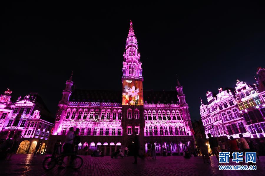 7月29日,人們在比利時(shí)布魯塞爾大廣場欣賞聲光秀,市政廳外墻上投射出鮮花地毯主題的圖案。7月29日,比利時(shí)布魯塞爾大廣場舉行大型聲光秀。藝術(shù)家在市政廳等歷史建筑上投影文字和圖案,紀(jì)念這個(gè)夏天受新冠疫情影響而不能如期舉辦的文化活動。新華社記者鄭煥松攝