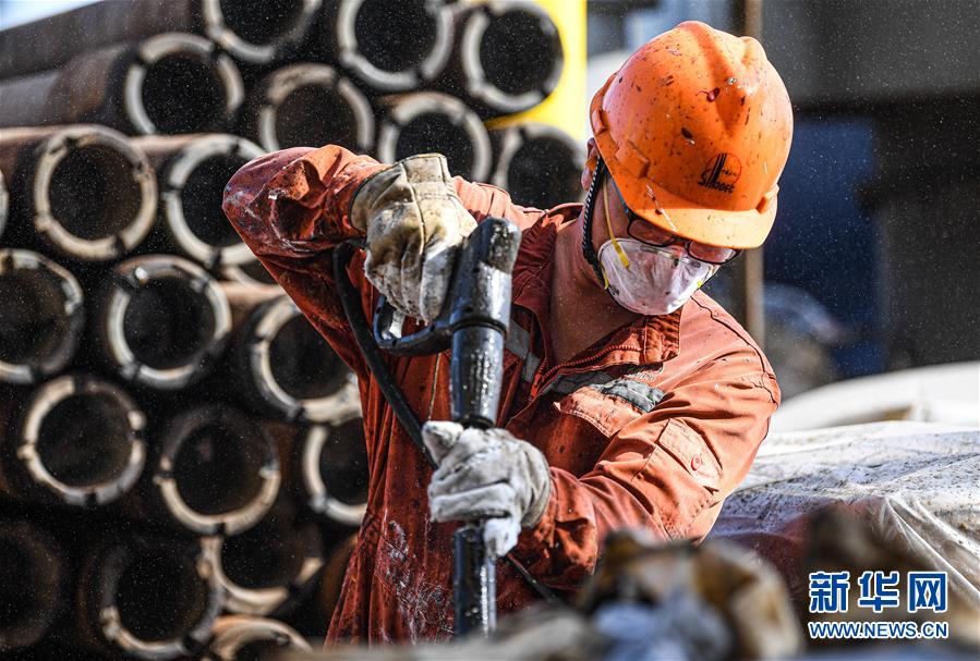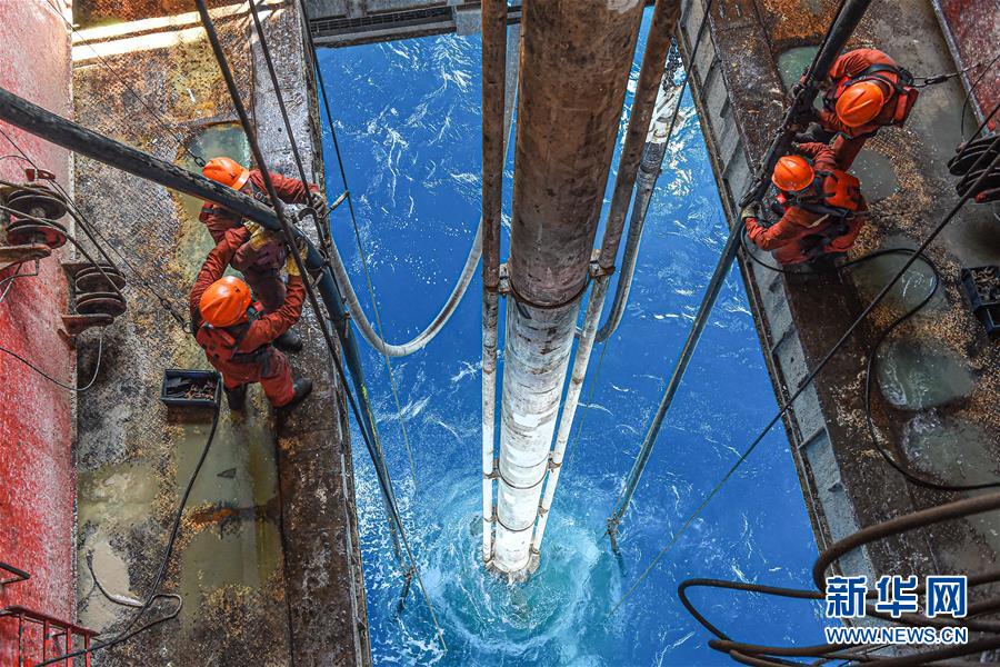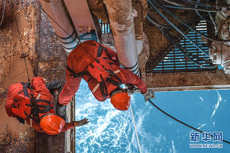 7月27日,工人在位于南海北部海域的勘探三號鉆井平臺上作業(yè)。新華社記者蒲曉旭攝