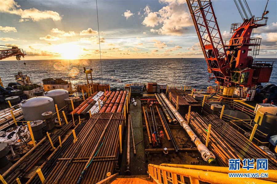 7月26日,在位于南海北部海域的勘探三號鉆井平臺上,鉆井工人在擺放鉆桿。新華社記者蒲曉旭攝