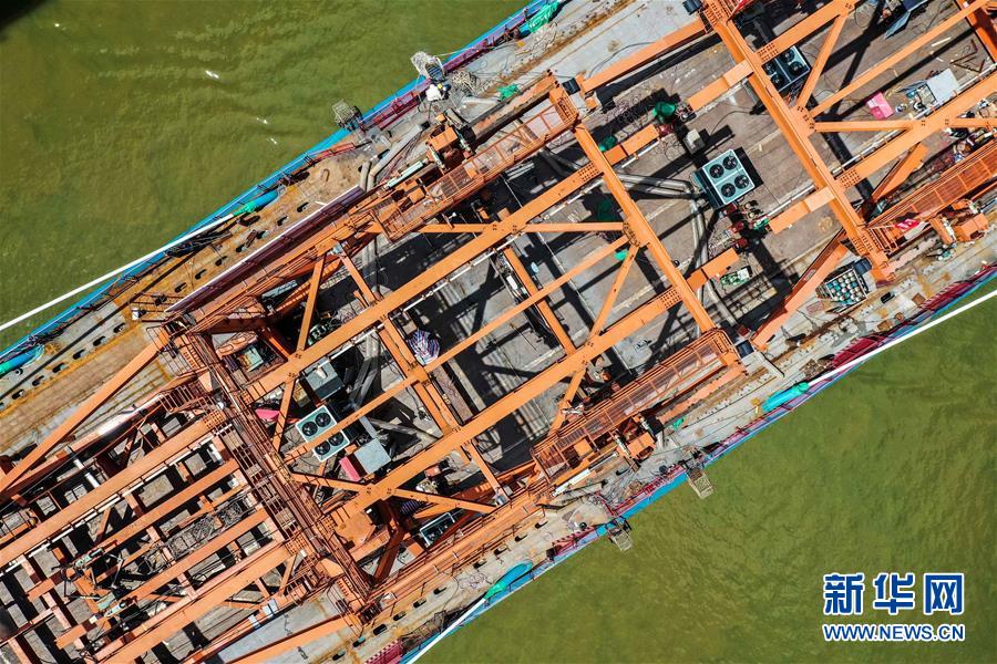 8月9日拍攝的廣州南沙港鐵路跨西江特大斜拉橋最后一塊鋼箱梁吊裝施工現(xiàn)場(無人機照片)。當日,中鐵十一局承建的粵港澳大灣區(qū)基礎設施“硬聯(lián)通”重點工程——廣州南沙港鐵路跨西江特大斜拉橋完成最后一塊鋼箱梁吊裝作業(yè),大橋即將合龍。該橋位于廣東佛山市和江門市交界處,全長1117.5米。新華社記者劉大偉攝。
