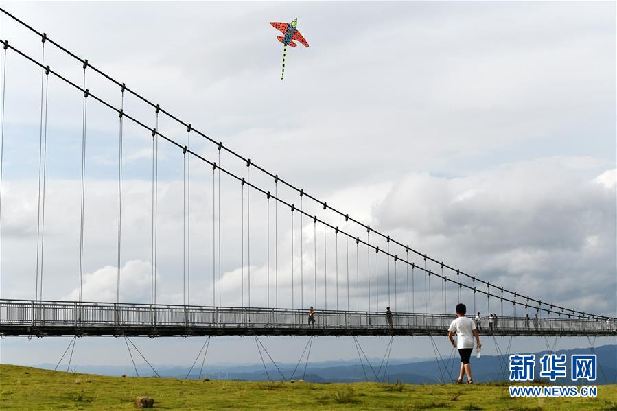 8月8日,游客在貴州省龍里油畫(huà)大草原的吊橋上觀光。近日,貴州省黔南布依族苗族自治州龍里縣境內(nèi)氣候宜人,龍里油畫(huà)大草原、“龍門(mén)鎮(zhèn)”武俠文化主題景區(qū)等景點(diǎn)吸引眾多游客前來(lái)觀光旅游。新華社記者楊文斌攝。