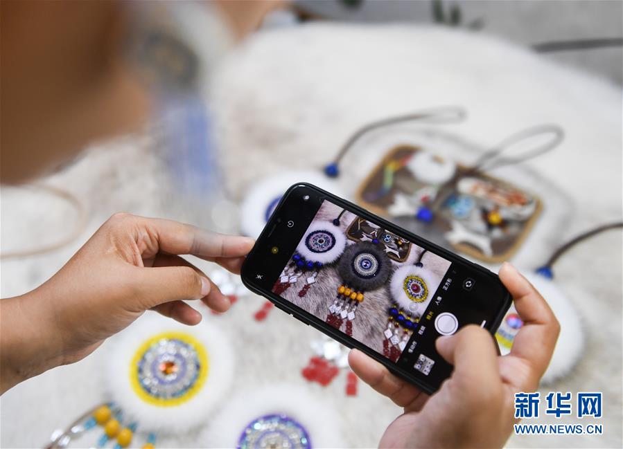 在內(nèi)蒙古自治區(qū)鄂溫克族自治旗巴彥托海鎮(zhèn)太陽花傳承發(fā)展中心,艾吉瑪在拍攝手工藝品照片(8月7日攝)。新華社記者劉磊攝。
