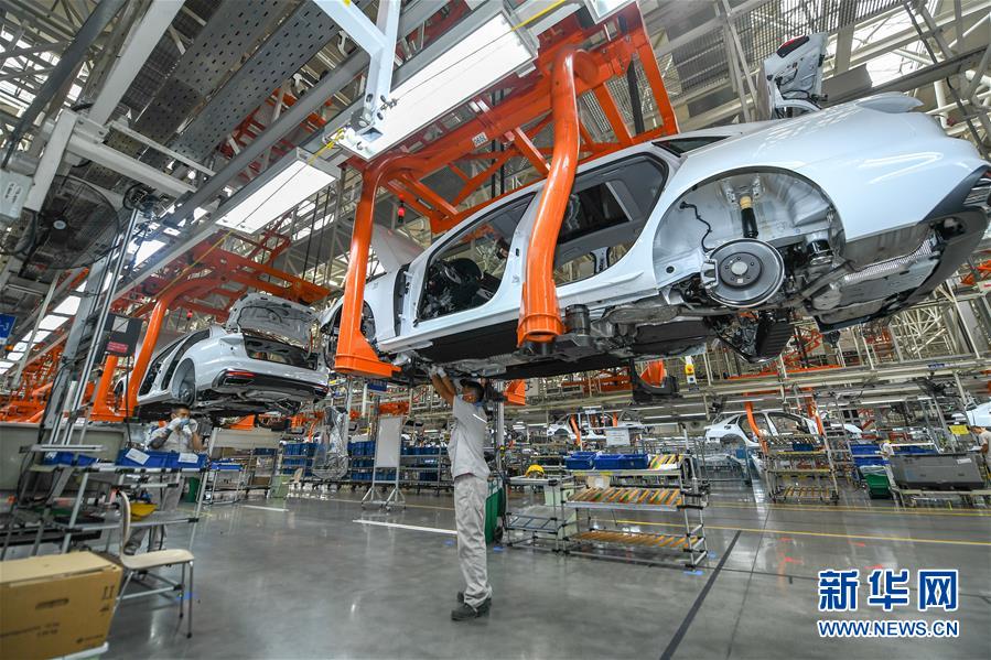 8月10日,在一汽-大眾長春基地總裝車間,工人在裝配車輛。中國第一汽車集團有限公司7月銷售整車32.2萬輛,同比增長23.2%,延續(xù)上半年的增長態(tài)勢。新華社記者張楠攝。