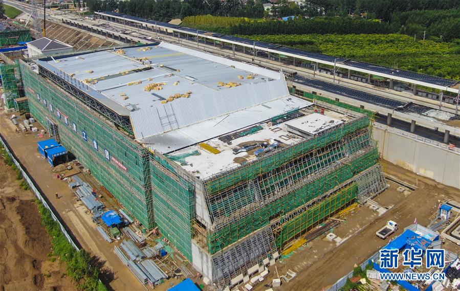 8月10日拍攝的建設(shè)中的京雄城際鐵路霸州北站(無人機(jī)照片)。京雄城際鐵路霸州北站站臺(tái)雨棚混凝土結(jié)構(gòu)施工日前全部完成,目前霸州北站已全面轉(zhuǎn)入裝飾裝修和機(jī)電安裝階段,預(yù)計(jì)2020年底投入使用。京雄城際鐵路是連接北京市區(qū)、大興機(jī)場和雄安新區(qū)的重要干線。建成后,將進(jìn)一步完善京津冀區(qū)域高速鐵路網(wǎng)結(jié)構(gòu),便利沿線群眾出行,對于推動(dòng)京津冀協(xié)同發(fā)展和支撐建設(shè)雄安新區(qū)具有重要意義。新華社記者李曉果攝。
