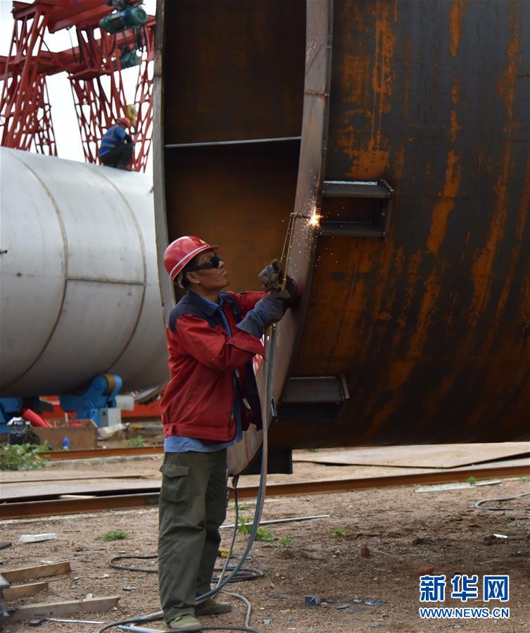 在黑龍江省訥河市華瑞生物醫(yī)藥項(xiàng)目焊接現(xiàn)場(chǎng),工人在焊接發(fā)酵罐(8月4日攝)。新華社記者梁冬攝。
