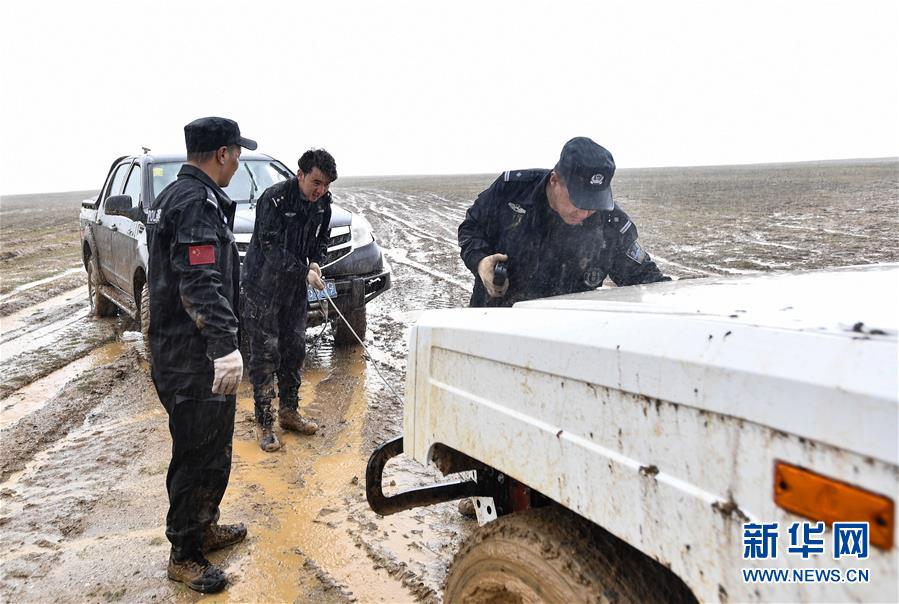 7月6日,卓乃湖保護站站長秋培扎西(右)和巡山隊員更松多杰(左)、白瑪東周在可可西里地區(qū)冒雨拉車。新華社記者張龍攝