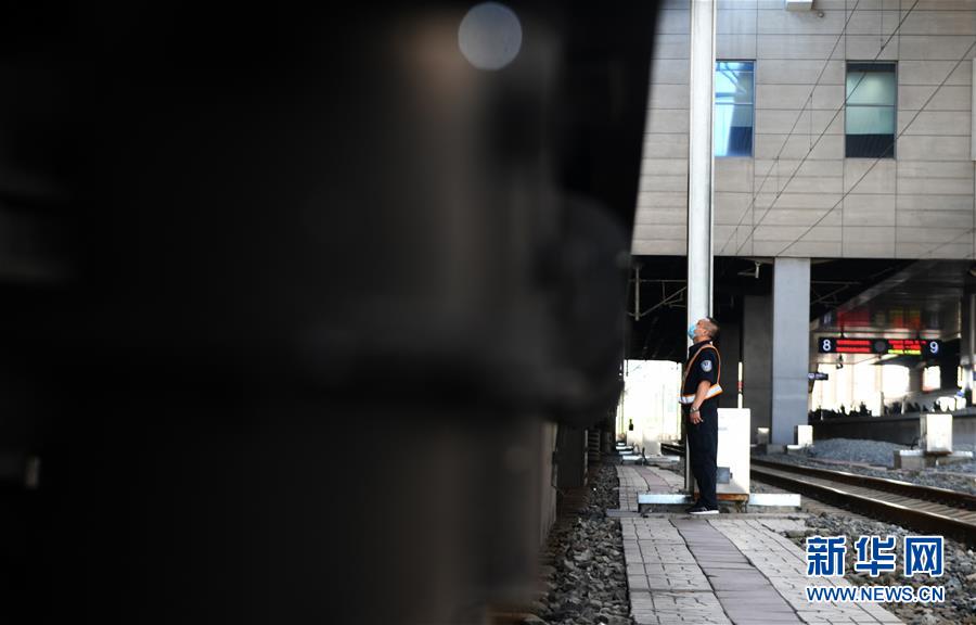 8月12日,長(zhǎng)春火車(chē)站客運(yùn)車(chē)間上水工常明結(jié)束上水工作后等候列車(chē)出站。新華社記者 林宏 攝