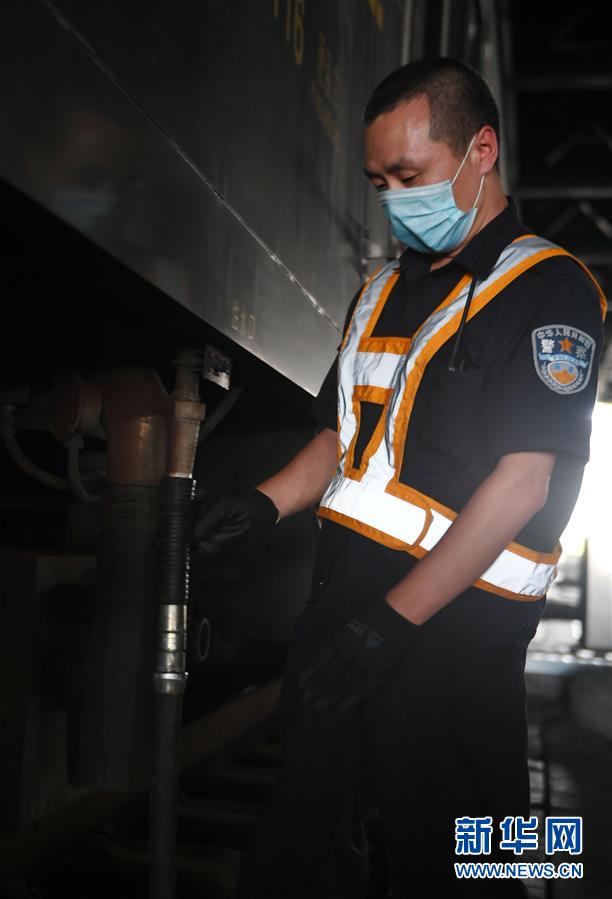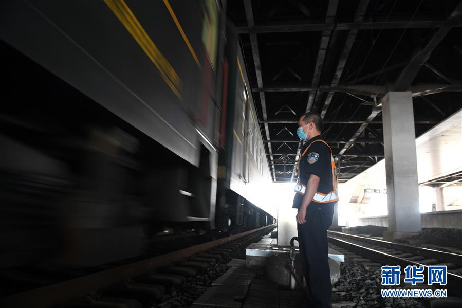 8月12日,長(zhǎng)春火車(chē)站客運(yùn)車(chē)間上水工韓冰等候列車(chē)停站。新華社記者 林宏 攝