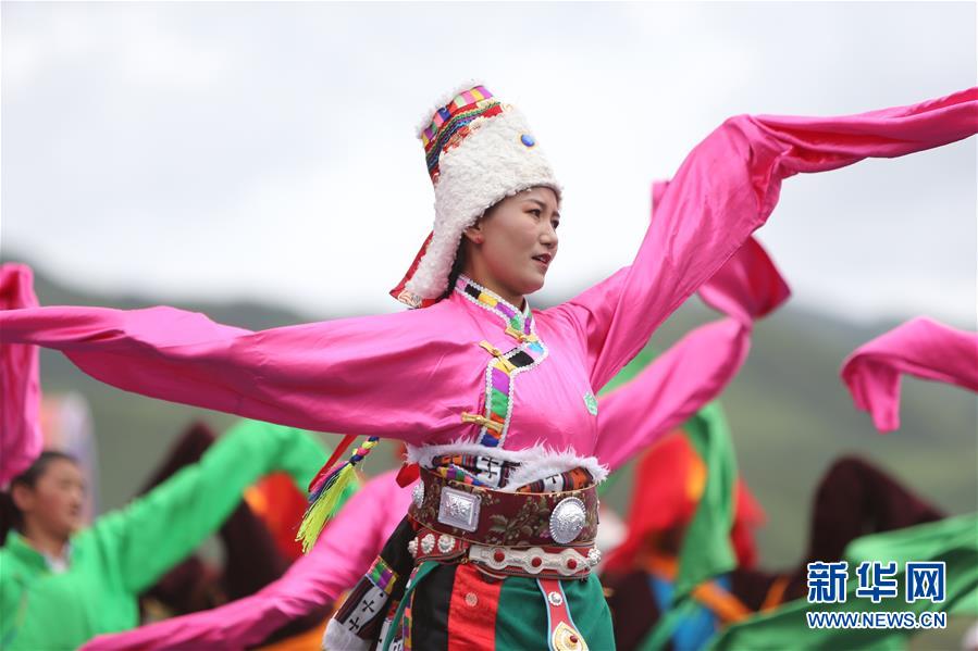 8月12日,演員在開幕式上表演舞蹈。當(dāng)日,2020中國(guó)碌曲鍋莊舞展演暨甘南藏族自治州第六屆少數(shù)民族傳統(tǒng)體育運(yùn)動(dòng)會(huì)在甘肅省甘南州碌曲縣夏澤灘草原上舉行。開幕式上,三千余名身著節(jié)日盛裝的演員和當(dāng)?shù)厝罕娫诓菰掀鹞瑁旰蟪跚绲牟菰铣錆M歡聲笑語。新華社記者 耿馨寧 攝