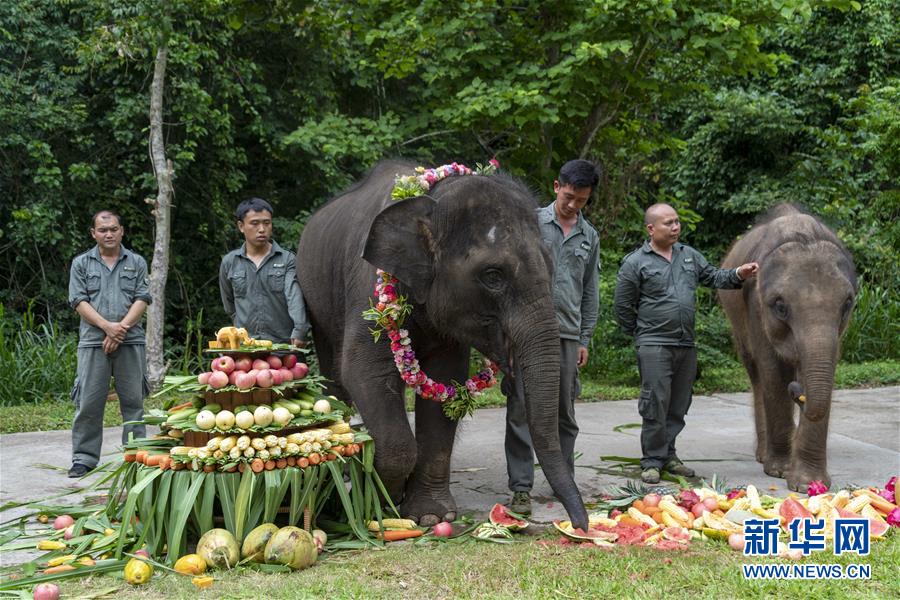 8月12日,在西雙版納傣族自治州亞洲象種源繁育及救助中心,救助象“羊妞”在自己的生日會(huì)上。新華社記者 陳欣波 攝