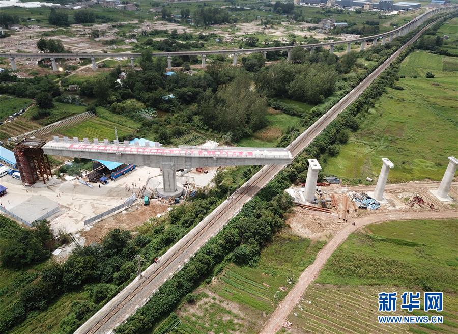 這是8月12日拍攝的水蚌鐵路蚌埠段改線工程?hào)|站疏解線特大橋跨越京滬鐵路上行線轉(zhuǎn)體梁轉(zhuǎn)體施工現(xiàn)場(無人機(jī)照片)。新華社記者 劉軍喜 攝