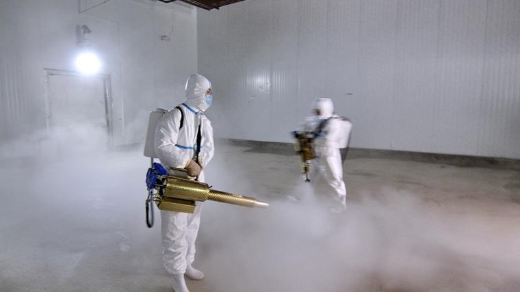 7月14日,北京二商肉類食品集團(tuán)有限公司員工在對(duì)肉類運(yùn)輸車輛??繀^(qū)域進(jìn)行防疫消毒。